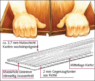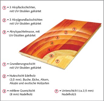 In Farben Eiche, Eiche Premium, Eiche avantgard, Buche hell, Buche gedämpft, Ahorn europ, Ahorn kanad., Fichte, Lärche, Merbau, Doussie Trend, Iroko Trend, Jatoba Trend, Kirsch Trend, Eiche cherry Trend.